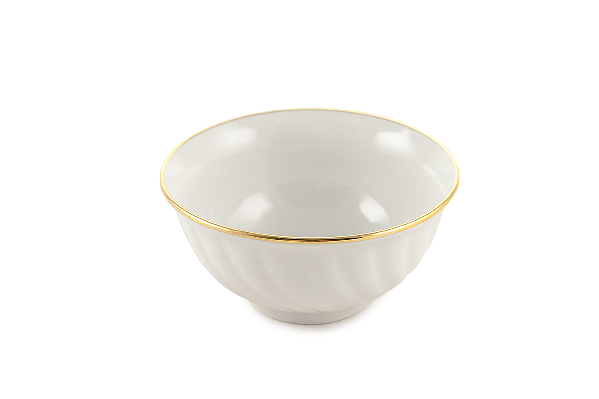 Салатник круглой формы со спиральным рельефом фасона “Голубая роза”.  Объем изделия 400мл, диаметр 134мм, высота 62мм.  Цвет белый с отводкой “Золото”, придающей изделию более праздничный и торжественный вид.  Салатник это достаточно универсальная посуда, которая подходит для подачи закусок и салатов, порционных блюд небольшого объема, а также десертов.  Салатник  гармонично дополнит сервировку с использованием других фарфоровых изделий  фасона “Голубая роза” Дулевского завода.