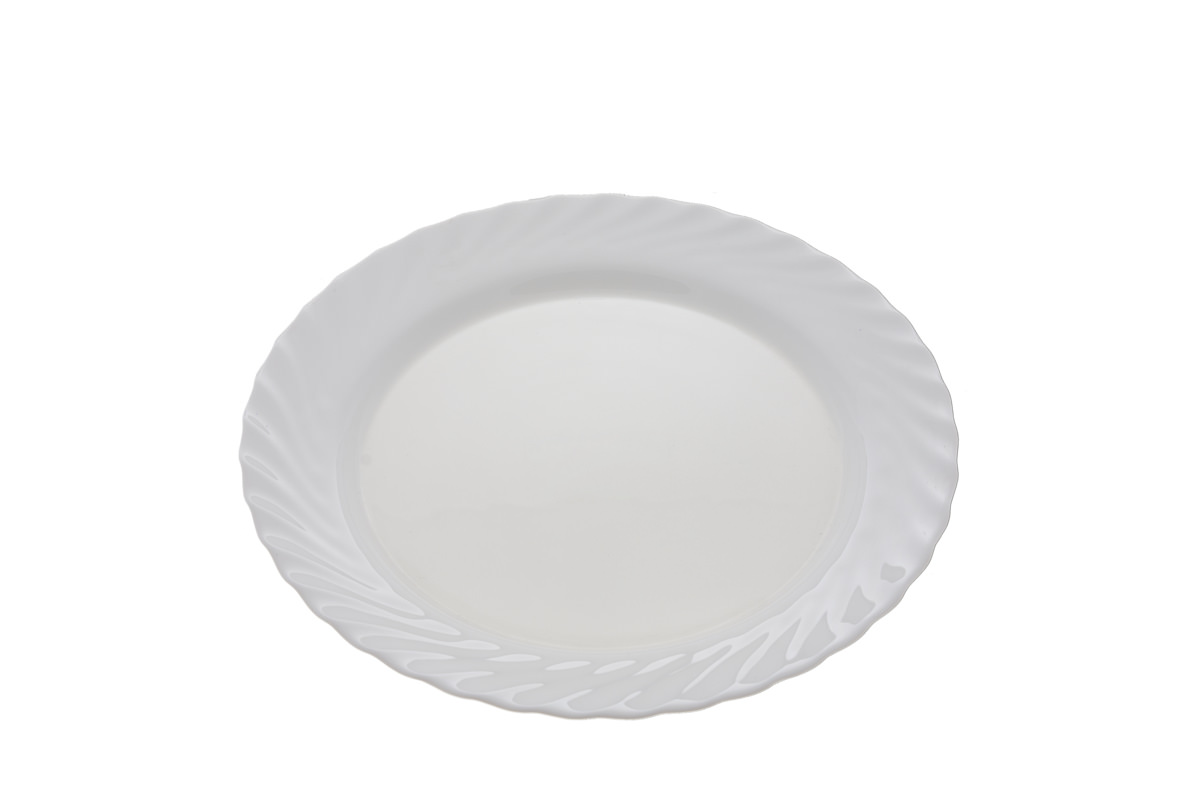 Круглое блюдо из стеклокерамики. Диаметр 315мм. Цвет белый без рисунка, поверхность со спиральным рельефом. Блюдо можно ставить в центр стола для подачи закусок, а также овощной и мясной нарезки, вторых блюд. Оно гармонично дополнит сервировку праздничного стола.